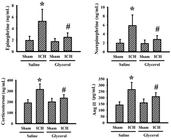 Stress hormones are adaptive molecules functioning in tissue homeostasis, while they also cause tissue/organ injury [10,11,12,16,17]. Hemorrhagic stroke rats exhibited increased levels of serum epinephrine, norepinephrine, corticosterone, and Ang II. Glycerol injection alleviated elevated stress hormones in hemorrhagic stroke rats (Figure 7). The findings suggest that ICH could increase stress hormone production, and the increments could be alleviated by glycerol.