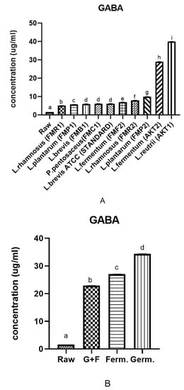 GABA, the main inhibitory neurotransmitter, has multiple physiological functions such as being a blood pressure regulator, cardiovascular disease defender and hormonal and cell regulator. It is also associated with brain and mental disorders [26]. Therefore, we first screened different fermentation bacteria (LABs) for GABA concentration (Figure 1A), as it is linked to stress-related disorders. Among 10 lactobacillus strains, L. reuterii (AKT1) showed the highest GABA concentration in HPLC detection (Table S1). All the results are expressed as the mean ± SD of triplicate analyses, and additional statistical analyses were carried out using they Tukey and Duncan tests, p ≤ 0.05. These results show L. reuterii as the most efficient bacteria in GABA production during fermentation among all other LABs used for screening. In raw rice, GABA content was found to be 1.61 ± 0.001 μg/mL, whereas in L. reuterii fermented brown rice it was 27.03 ± 0.055 μg/mL. In this research, we found a higher GABA concentration than reported by Cáceres et al. and Le et al. [27,28].