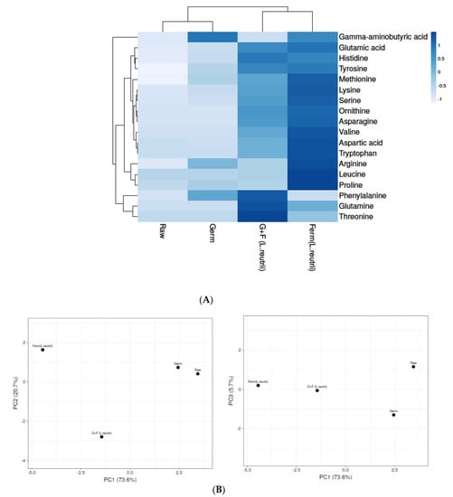 Levels of amino acids in raw, germinated, fermented (L. reuterii AKT1) and G+F (L. reuterii AKT1) samples. (A) The heat map shows different levels of amino acids in samples based on shades of blue. (B) Identification of principal component analysis (PCA) of Raw, Germ, Ferm (L. reuterii) and G+F samples was shown by comparing PC1 with PC2 and PC 1 with PC3. Germ-germinated brown rice, Ferm- fermented brown rice, G+F-germinated + fermented brown rice.