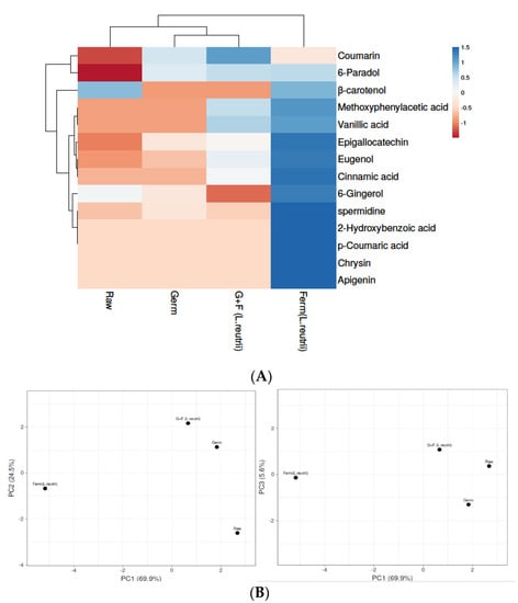 Levels of phenolic compounds in raw, germinated, fermented (L. reuterii AKT1) and G+F (L. reuterii AKT1) samples. (A) The heat map shows different levels of phenolic compounds in samples based on colors from blue to red, representing the level of phenolic compounds in decreasing order. (B) Identification of principal component analysis (PCA) of Raw, Germ, Ferm (L. reuterii) and G+F samples was shown by comparing PC1 with PC2 and PC1 with PC3. Germ- germinated brown rice, Ferm- fermented brown rice, G+F-germinated + fermented brown rice.
