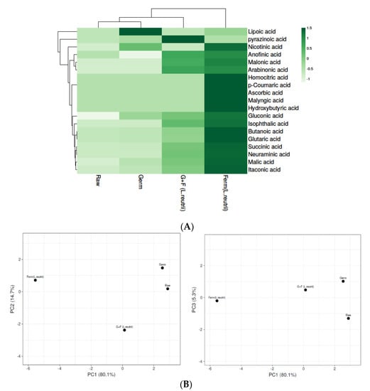 Levels of organic acids in Raw, Germinated, Fermented (L. reuterii AKT1) and G+F (L. reuterii AKT1) samples. (A) The heat map shows different levels of organic acids in samples based on colours as green to white represents the level of organic acids in decreasing order. (B) Identification of principal component analysis (PCA) of Raw, Germ, Ferm (L. reuterii AKT1) and G+F samples was shown by comparing PC1 with PC2 and PC1 with PC3. Germ- germinated brown rice, Ferm- fermented brown rice, G+F- germinated + fermented brown rice.
