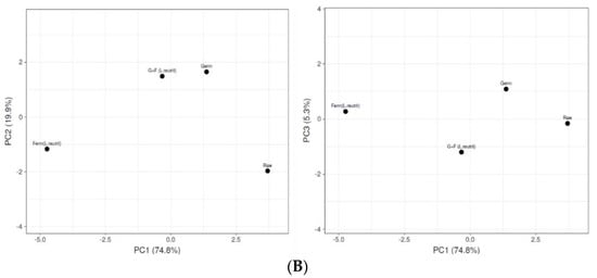 Additionally, to understand the correlations and diversity among differently treated samples, as well as for the better elucidation of results, PCA was also performed by combining all the analyses together (amino, phenolic, organic and fatty acids) (Figure S2). In joint PCA, fermented BR was found to be divergent from the other three samples, similar to that which we have observed in all separate analyses. Additionally, Germ BR and Raw BR were found to be correlated with each other.