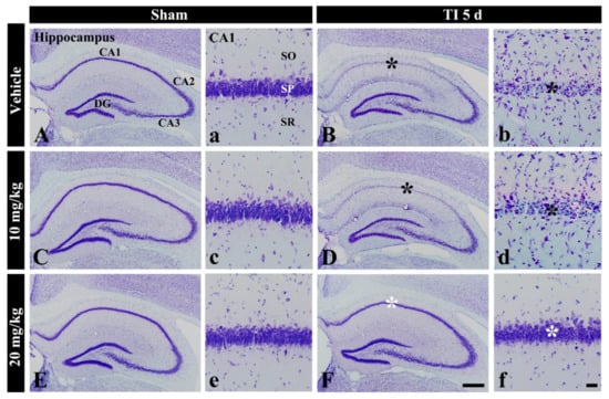 CV staining in the hippocampus of the vehicle-sham (A,a), vehicle-TI (B,b), 10 mg/kg salicin-sham (C,c), 10 mg/kg salicin-TI (D,d), 20 mg/kg salicin-sham (E,e), and 20 mg/kg salicin-TI (F,f) groups at 5 days post-TI. In the vehicle-TI and 10 mg/kg salicin-TI groups, CV stainability in the stratum pyramidale (SP, black asterisks) of CA1 is very pale. However, in the 20 mg/kg salicin-TI group, strong CV stainability is observed in the SP (white asterisks) (n = 5/group; the vehicle-sham group was regarded as control group). DG, dentate gyrus. SO, stratum oriens; SR, stratum radiatum. Scale bar = 400 μm (A–F) and 50 μm (a–f).
