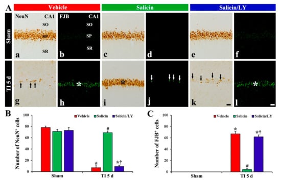 (A) NeuN immunohistochemistry (a,c,e,g,i,k) and FJB histofluorescence (b,d,f,h,j,l) in CA1 of the vehicle-sham (a,b), vehicle-TI (g,h), salicin-sham (c,d), salicin-TI (i,j), salicin/LY-sham (e,f), and salicin/LY-TI (k,l) groups at 5 days post-TI. A few NeuN+ pyramidal cells (black arrows) and many FJB+ pyramidal cells (white asterisk) are detected in the vehicle-TI group. In the salicin-TI group, however, abundant NeuN+ cells (black asterisk) and a few F–J B+ cells (white arrows) are observed in the SP. On the contrary, in the salicin/LY-TI group, the distribution pattern and number of NeuN+ and FJB+ cells (black arrows and white asterisk) in the SP are similar to those in the vehicle-TI group. Scale bar = 50 μm. (B,C) The mean numbers of NeuN+ pyramidal neurons (B) and FJB+ pyramidal neurons (C) in CA1. The bars indicate the means ± SEM (n = 5/group, * p < 0.05 vs. each sham group, # p < 0.05 vs. vehicle-TI group, † p < 0.05 vs. salicin-TI group; the vehicle-sham group was regarded as control group).