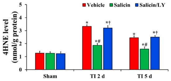 Level of 4HNE in the vehicle-treated, salicin-treated, and salicin/LY-treated groups at sham, 2 days, and 5 days after TI. In the salicin-TI group, 4HNE level is significantly reduced compared with that at the corresponding time of the vehicle-TI group. However, in the salicin/LY-TI group, 4HNE level is similar to that in the vehicle-TI group. The bars indicate the means ± SEM (n = 5 at each time, * p < 0.05 vs. each sham group, # p < 0.05 vs. vehicle-TI group, † p < 0.05 vs. salicin-TI group; the vehicle-sham group was regarded as control group).