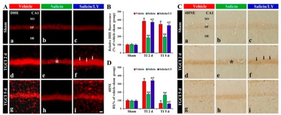 (A,C) DHE fluorescence (A) and 4HNE immunohistochemistry (C) in CA1 of the vehicle-treated (left columns), salicin-treated (middle columns), and salicin/LY-treated (right columns) groups at sham (Aa–Ac,Ca–Cc), 2 days (Ad–Af,Cd–Cf), and 5 days (Ag–Ai,Cg–Ci) after TI. In the salicin-TI group, DHE fluorescence and 4HNE immunoreactivity in pyramidal cells (asterisks) are significantly lower than that in the vehicle-TI group. However, in the salicin/LY-TI group, DHE fluorescence (white arrows) and 4HNE immunoreactivity (black arrows) are significantly higher than that in the salicin-TI group. Scale bar = 50 μm. (B,D) RI of DHE fluorescence (B) and 4HNE (D) in pyramidal cells. The bars indicate the means ± SEM (n = 5 at each time, * p < 0.05 vs. each sham group, # p < 0.05 vs. vehicle-TI group, † p < 0.05 vs. salicin-TI group; the vehicle-sham group was regarded as control group).