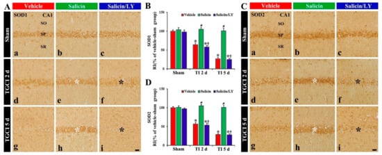 In contrast, in the salicin/LY-TI group, SOD1 and SOD2 immunoreactivity in the pyramidal cells at 2 days and 5 days post-TI were similar to those in the vehicle-TI group (Figure 5A(f),A(i),B,C(f),C(i),D), showing that, in the salicin/LY-sham group, SOD1 and SOD2 immunoreactivity were similar to those in the vehicle-sham group (Figure 5A(c),B,B(c),D).