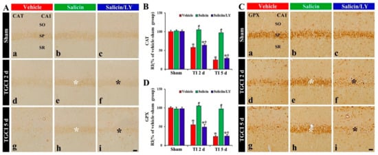 In the vehicle-sham and salicin-sham groups, CAT and GPX immunoreactivity were principally shown in the pyramidal cells, and each immunoreactivity was similar in the two sham groups (Figure 6A(a),A(b),B,C(a),C(b),D).