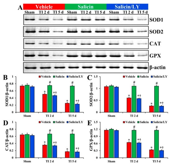 (A) Western blot images of SOD1, SOD2, CAT, and GPX in CA1 of the vehicle-treated, salicin-treated, and salicin/LY-treated groups at sham, 2 days, and 5 days after TI. In the salicin-TI group, each SOD1, SOD2, CAT, and GPX level is significantly higher than that in the vehicle-TI group. While in the salicin/LY-TI group, each SOD1, SOD2, CAT, and GPX level is similar to that in the vehicle-TI group. (B–E) Quantitative analyses of SOD1 (B), SOD2 (C), CAT (D), and GPX (E) level by normalization to the level of β-actin, respectively. The bars indicate the means ± SEM (n = 5 at each time, * p < 0.05 vs. each sham group, # p < 0.05 vs. vehicle-TI group, † p < 0.05 vs. salicin-TI group; the vehicle-sham group was regarded as control group).