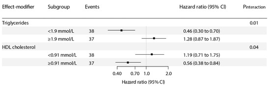 For the association of plasma vitamin C with risk of graft failure, we found signs of a significant interaction with triglycerides and HDL cholesterol (pinteraction = 0.01 and 0.04, respectively; Table S1). In stratified analyses, we found that plasma vitamin C was inversely associated with risk of graft failure particularly in KTR with triglycerides concentration of <1.9 mmol/L (HR, 0.46; 95% CI, 0.30–0.70 per 1-SD relative increment; p < 0.001; Figure 2) or <1.7 mmol/L (common clinical cut-off point; HR, 0.49; 95% CI, 0.30–0.79 per 1-SD relative increment; p < 0.003; Table S2) and HDL cholesterol concentration of ≥0.91 (HR, 0.56; 95% CI 0.38–0.84 per 1-SD relative increment; p = 0.01; Figure 2) and ≥1.1 mmol/L (common clinical cut-off point; HR, 0.41; 95% CI 0.25–0.68 per 1-SD relative increment; p = 0.001; Table S2). Similar results on interaction analyses were found over tertiles of plasma vitamin C (Table 3 and Table S2).