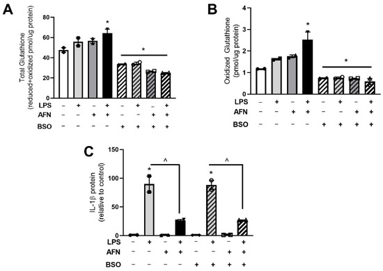 To evaluate the impact of LPS and AFN on de novo glutathione synthesis, MH-S cells were treated with LPS and/or AFN in the presence or absence of buthionine sulfoximine BSO. BSO inhibits the rate-limiting enzyme in glutathione synthesis (gamma-glutamylcysteine synthetase); thus, treatment with BSO prevented de novo glutathione synthesis. BSO decreased basal levels of total and oxidized glutathione (Figure 5a,b). The effects of BSO did not differ in cells cultured in the presence or absence of AFN or LPS. As previously demonstrated, AFN attenuated LPS-induced increases in Il-1β protein levels (Figure 5c) [12]. Il-1β protein levels did not differ between LPS + AFN-treated cells cultured in the presence or absence of BSO.