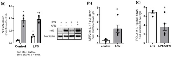 NRF2 nuclear localization and binding to IL1-β promoter. (a) Nuclear localization of NRF2 protein was identified at 1 h post AFN treatment. (b) Chromatin immunoprecipitation (ChIP) assay using IL-1β antibody revealed NRF2 protein directly binds to the Il1b promoter and (c) inhibits transcription by interfering with polymerase 2 (POL2) binding. White bars indicate DMSO control, and grey bars indicate AFN-treated. ChIP results were analyzed by Mann–Whitney, n = 3. For NRF2 nuclear localization, data were analyzed by two-way ANOVA to identify the effects of LPS and/or AFN exposure. Tukey’s post-hoc analysis was used to determine significant differences between groups; n = 3 individual experiments. * p < 0.005 from control non-stimulated. $ p < 0.05 from control LPS.