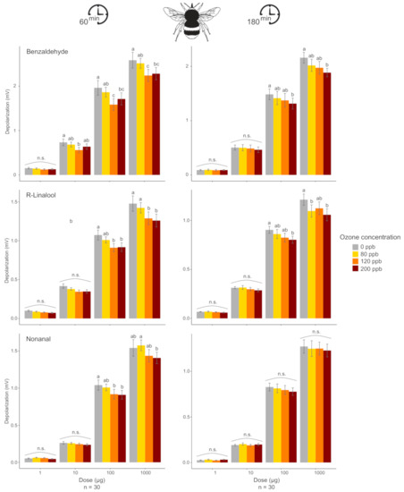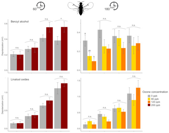 2.3. Does O3 Concentration Affect Pollinator Antenna Sensitivity?
