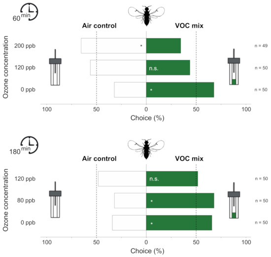 Effect of O3 exposure on the attraction of fig wasps to the VOC mix mimicking fig odor or clean air in Y-tube olfactometers (n, number of specimens tested). Prior to the behavioral test, wasps were exposed to different O3 concentrations for 60-min or 180-min. Asterisks indicate a significant preference based on two-sided binomial tests (* p < 0.05).