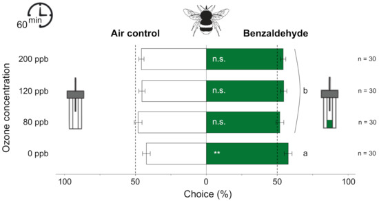 Effect of 60-min O3 exposure on the attraction (mean ± SE based on the percentage of bouts) of bumblebee foragers to benzaldehyde or clean air in Y-tube olfactometers (n, number of specimens tested). Asterisks indicate a preference, according to the paired Wilcoxon signed-rank tests (** p < 0.01), and different letters indicate a significant difference in choice among O3 treatments, according to the multiple pairwise comparisons based on the binomial model (p < 0.05).