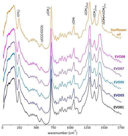 Figure 4 shows the Raman spectra recorded for the same samples. The spectra show some typical features of phenolic acids and esters [31,49,50,51]. In particular, the ν (C = O) mode detected at ca. 1747 cm−1, assigned to the esterified species, is not observed in the INS spectra as it does not involve hydrogen motion, as shown in Figure 4A. Also, the same peak is not present in either the secoiridoids or hydroxytyrosol constituents (Figure 4B). A detailed analysis of the Raman features of the carbonyl stretching modes characteristic of phenolic acids and esters, respectively at 1655 and 1747 cm−1, in the series of EVOOs and sunflower oil (Table 2), provides insight into the relative amount of phenolic esters versus acids in these samples. The I1655/I1747 ratio lies within the range from 4.39 to 4.59 for the olive oils, while a higher value of about 5 was obtained for sunflower oil, evidencing a higher content in esters for the EVOOs. The two monocultivar species from the Toscana region (Italy) (EVOO2 and EVOO4) display the lowest I1655/I1747 ratio (respectively 4.39 and 4.43), revealing a slightly larger amount of phenolic esters as compared to the other EVOOs.
