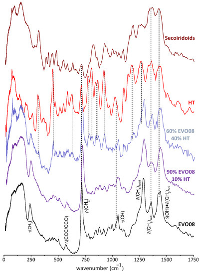 INS spectra (0–1750 cm−1) of extra virgin olive oil (EVOO8), hydroxytyrosol (HT) and secoiridoids, and two different mixtures of EVOO8 and HT (9:1 and 6:4)).