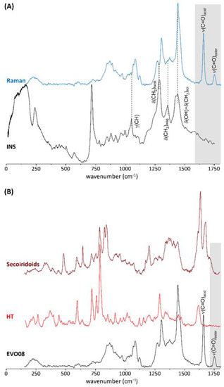 (A)—INS and Raman spectra (0–1750 cm−1) of extra virgin olive oil (EVOO8); (B)—Raman spectra (0–1750 cm−1) of EVOO8 and the reference compounds hydroxytyrosol and secoiridoids.