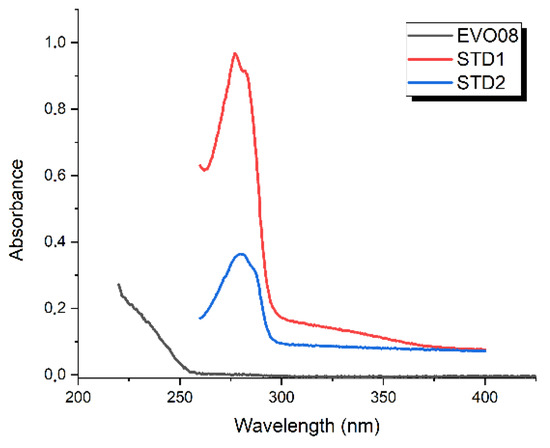 Finally, Figure 5 shows the UV-Vis absorbance spectra of the EVOO8, STD1, and STD2 samples. The spectra of both STD1 and STD2 show a pronounced peak at about 280 nm, very similar to that found for oleuropein [10], making it difficult to discriminate among the several MPCs present in the EVOOs using this technique. Moreover, the 280 nm absorption becomes completely negligible in the case of the olive oil samples, as shown in Figure 5 for the particular case of EVOO8, which shows a sharp increase in the absorbance curve for wavenumbers lower than 255 nm.