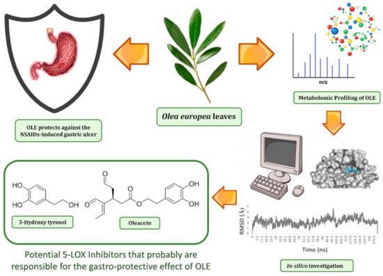 The present investigation highlighted the potential gastroprotective effect of OLE against NSAIDs-induced gastritis and gastric ulcers (Figure 8). The LC-HRMS-based chemical profiling of OLE revealed the abundance of many phenolic putative compounds that can exert a profound antioxidant activity, which in turn can accelerate the ulcer healing process. To find out the most probable molecular target of these putative compounds that may also be involved in the gastro-protective effect of OLE, a comprehensive pharmacophore-based virtual screening was conducted and ended up with 5-LOX as the most possible hit. Afterwards, in vitro inhibitory testing, validated the initial virtual screening suggestion, where HT and OC showed a very potent inhibitory activity towards 5-LOX. Docking investigation, MDS, and binding free energy calculations were further shown the possible molecular interactions of each compound inside the enzyme’s active site. The present study revealed the potential of O. europea in providing unique lead putative compounds with potent biological activities for the management of gastric ulcers and highlighted the efficiency of the in silico based investigations in the facilitating of drug discovery and development processes. Further clinical studies are required to support our present investigation and to find out the most suitable dosage form for this valuable natural product.
