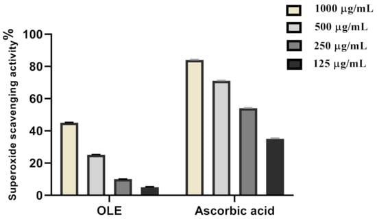 Over the past years, it has been elucidated that multiple reactive oxygen species are present in the biological systems that have the potential to induce damage. These reactive oxygen species include superoxide radical which participates in the formation of gastric lesions [46]. Therefore, it is rational to evaluate the superoxide scavenging activity of OLE and the results were shown in Figure 4 and Table 2. The scavenging effect increases with the concentration of standard and extract, the Olea europea extract exhibited the highest superoxide radical scavenging activity. At 1000 μg/mL concentration, the OLE ethanolic extract possessed 45% scavenging activity on superoxide. The concentration of OLE extract needed for 50% inhibition (IC50) was found to be 419.5 µg/mL, whereas 161.4 μg/mL was needed for ascorbic acid. This leads to the assumption that OLE is a potent gastroprotective by scavenging both hydrogen peroxide and superoxide radicals, as well.
