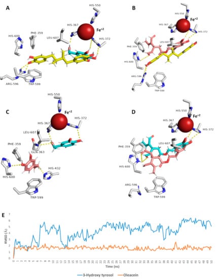 To have some insight into their 5-LOX’s mode of inhibition, we subjected both 3-hydroxy tyrosol (HT) and oleacein (OC) (4 and 18, respectively) to an ensemble docking protocol. Both compounds got convergent binding scores (−7.1 and −8.3 kcal/mol). In addition, their binding modes were comparable with that of the co-crystalized inhibitor nordihydroguaiaretic acid (NDGA) [55]. As shown in Figure 7A,B, the catechol moiety of both HT and OC took orientations near the Fe+2 similar to the co-crystalized inhibitor NDGA, and hence, they prevent the activation of the enzyme by the conversion of Fe+2 to Fe+3. Several previous plant polyphenols were reported to inhibit LOXs via their antioxidant properties [56]. HT was also able to form additional strong H-bonds (<2.5 Å) with HIS-367 and HIS-372, while the extended side chain of OC was involved in H-bonding with HIS-600 and hydrophobic interaction with PHE-359. Further 50 ns MDS refinement revealed that OC was more stable inside the binding site and deviated slightly from its original orientation (~RMSD = 1.3 Å), while HT was less stable (~RMSD = 4.8 Å) in comparison with OC, where it took a different orientation at the end of MDS (Figure 7). This behavior inside the 5-LOX binding cavity was reflected in the varying binding free energies (ΔG) of both compounds, where HT got a ΔG value of −4.4 kcal/mol, while OC got a lower value of −8.1 kcal/mol. On the other hand, both compounds were found to obey both Lipinski’s and Veber’s rules of drug-likeness [56,57] and hence, they represent good lead compounds for further development. Such structural and binding mode information explains the superior activity of OC as a 5-LOX inhibitor over that of HT and can be utilized in the future for the development of more optimized inhibitors. Additionally, these findings highlighted the potential of natural products as safe, effective, and readily available therapeutic alternatives for the management of gastric ulceration, which was particularly produced as a result of the long-term use of NSAIDs.