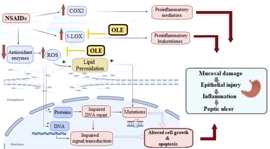 Non-steroidal anti-inflammatory drugs (NSAIDs) are among the most common causes behind this medical condition, where they are able to disrupt the cyclooxygenase-dependent-gastro-protection. At the same time, they activate the 5-lipoxygenase (5-LOX) signaling pathway that eventually led to gastric mucosal injury due to the elevated oxidative stress and severe vasoconstriction [10,11,12,13]. In addition to inhibiting cyclooxygenase and decreasing prostaglandin production, NSAIDs induce mucosal damage via ROS production by recruited leukocytes. ROS-mediated mitochondrial damage as well as lipid, protein, and DNA oxidation lead to apoptosis and mucosal injury [12,13].