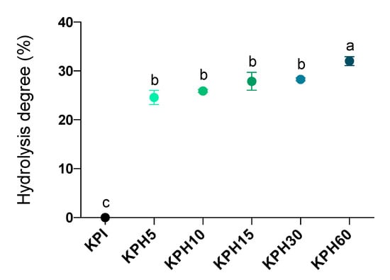 Hydrolysis degree time-course of the KPI during enzymatic hydrolysis by Bioprotease at 5 (KPH5), 10 (KPH10), 15 (KPH15), 30 (KPH30) and 60 (KPH60) min. Data are expressed as the percentage of cleaved peptide bonds (left y-axis). Values are represented as means ± standard deviation of three determinations. Statistical differences are marked with different letters (p < 0.05).