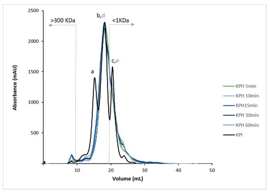 Molecular weight (MW) profiles by FPLC (size-exclusion) chromatogram of KPI and KPH5, KPH10, KPH15, KPH30, and KPH60. MW ranging from 1 to 300 kDa.