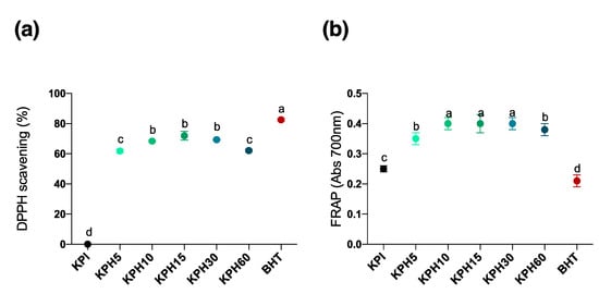 (a) DPPH free radical scavenging activity and (b) FRAP (ferric reducing antioxidant power) of KPI and KPHs obtained with Bioprotease in an in vitro cell-free experiments. Values are represented as means ± standard deviation of three determinations. Statistical differences are marked with different letters (p < 0.05).