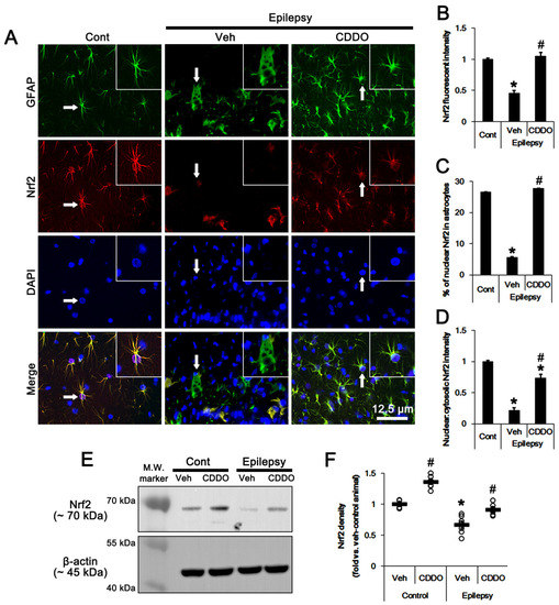 Effects of CDDO-Me on nuclear factor-erythroid 2-related factor 2 (Nrf2) expression and its nuclear accumulation in CA1 astrocytes of control and epileptic rats. As compared to control animals (Cont), Nrf2 expression and its nuclear accumulation were reduced in CA1 astrocytes in epileptic rats. CDDO-Me increased Nrf2 expression and its nuclear accumulation in CA1 astrocytes, as compared to vehicle (Veh). (A) Representative photos demonstrating astroglial Nrf2 expression in CA1 astrocytes. Arrows indicate the inserted magnification photos. (B–D) Quantifications of Nrf2 expression (B), the fraction of astrocytes showing Nrf2 signals in total astrocytes (C) and the ratio of nuclear:cytosolic Nrf2 intensity (D) in CA1 astrocytes. Error bars indicate SEM (*,# p < 0.05 vs. control and vehicle-treated epileptic rats, respectively; n = 7). (E) Representative Western blot for Nrf2 in the CA1 region. (F) Quantitative values (mean ± SEM) of the Western blot data concerning Nrf2 expression level (n = 7, respectively). Open circles indicate each value. Horizontal bars indicate the mean value. Significant differences are *,# p < 0.05 vs. control animals and vehicle-treated animals.