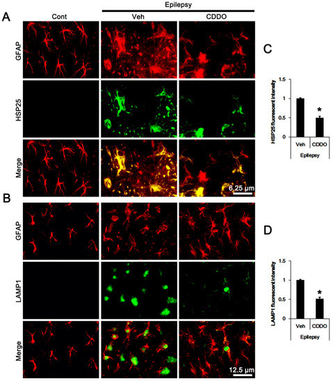 Effects of CDDO-Me on HSP25 and LAMP1 expressions in CA1 astrocytes in control and epileptic rats. As compared to control animals (Cont), expressions of heat shock protein 25 (HSP25) and lysosomal-associated membrane protein 1 (LAMP1) were increased in CA1 astrocytes in epileptic rats. CDDO-Me decreased both HSP25 and LAMP1 expressions in CA1 astrocytes, as compared to vehicle (Veh). (A,B) Representative photos demonstrating astroglial HSP25 (A) and LAMP1 (B) expressions in CA1 astrocytes. (C,D) Quantifications of HSP25 (C) and LAMP1 (D) expression in CA1 astrocytes. Error bars indicate SEM (* p < 0.05 vs. vehicle-treated epileptic rats, respectively; n = 7).