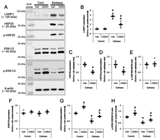 Western blots showed the increase in LAMP1 expression in the epileptic hippocampus (t(12) = 16.1, p < 0.00001 vs. control animals, Student t-test, n = 7, respectively; Figure 3A,B), accompanied by upregulated HSP25 and phospho (p)-HSP25 levels (Figure 3A). In contrast, p-ERK1/2 level was significantly lower in the epileptic hippocampus than the control (t(12) = 12.1, p < 0.00001 vs. control animals, Student t-test, n = 7, respectively; Figure 3A,F–H, Figure S2). CDDO-Me decreased LAMP1 expression level to ~0.52-fold of vehicle level in epileptic animals, respectively (F(3,24) = 106, p < 0.00001 vs. vehicle, one-way ANOVA, n = 7, respectively; Figure 3A,B). CDDO-Me also reduced HSP25 (t(12) = 9.3, p < 0.00001 vs. vehicle, Student t-test, n = 7, respectively; Figure 3A,C) and p-HSP25 levels (t(12) = 6.1, p = 0.00006 vs. vehicle, Student t-test, n = 7, respectively; Figure 3A,D) without altering the p-HSP25 phosphorylation ratio (Figure 3A,E). However, CDDO-Me increased p-ERK1/2 level (F(3,24) = 211.1, p < 0.00001 vs. vehicle, one-way ANOVA, n = 7, respectively; Figure 3A,G) and p-ERK1/2 ratio (F(3,24) = 88.6, p < 0.00001 vs. vehicle, one-way ANOVA, n = 7, respectively; Figure 3A,H) in control and epileptic rats without changing ERK1/2 expression level (Figure 3A,F, Figure S2). Considering CDDO-Me induced ERK1/2 activation, and the negative effect of ERK1/2 on SP1-mediated HSP25 induction [25,35], these findings indicate that CDDO-ME may ameliorate clasmatodendrosis of CA1 astrocytes by activating ERK1/2-mediated HSP25 inhibition.