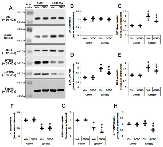 Effects of CDDO-Me on AKT, p-AKT, Bif-1, PTEN and p-PTEN levels in the CA1 region of control and epileptic rats. As compared to control animals (Cont), AKT-S473 phosphorylation and bax-interacting factor 1 (Bif-1) expression were lower in the CA1 region of epileptic rats. However, PTEN expression and its phosphorylation were also decreased in epileptic rats. CDDO-Me treatment attenuated the increases in AKT phosphorylation and Bif-1 expression in epileptic rats. In addition, CDDO-Me reduced p-PTEN level in epileptic rats without affecting its protein expression level. (A) Representative Western blot for AKT, p-AKT, Bif-1, PTEN and p-PTEN in the CA1 regions. (B–H) Quantitative values (mean ± SEM) of protein, phosphorylation and phosphorylation ratio concerning AKT (B–D), Bif-1 (E) and PTEN (F–H) (n = 7, respectively). Open circles indicate each value. Horizontal bars indicate the mean value. Significant differences are *,# p < 0.05 vs. control animals and vehicle-treated animals.