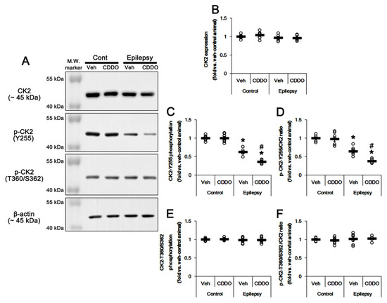 Effects of CDDO-Me on CK2 and p-CK2 levels in the CA1 region of control and epileptic rats. As compared to control animals (Cont), casein kinase 2 (CK2)-Y255, but not T360/S362, phosphorylation was reduced in the CA1 region of epileptic rats without altering its expression level. CDDO-Me treatment decreased CK2-Y255 phosphorylation more in epileptic rats. (A) Representative Western blot for CK2 and p-CK2 in the CA1 regions. (B–F) Quantitative values (mean ± SEM) of protein, phosphorylation and phosphorylation ratio concerning CK2 (B), p-CK2-Y255 (C,D) and p-CK2-T360/S362 (E,F) (n = 7). Open circles indicate each value. Horizontal bars indicate the mean value. Significant differences are *,# p < 0.05 vs. control animals and vehicle-treated animals.