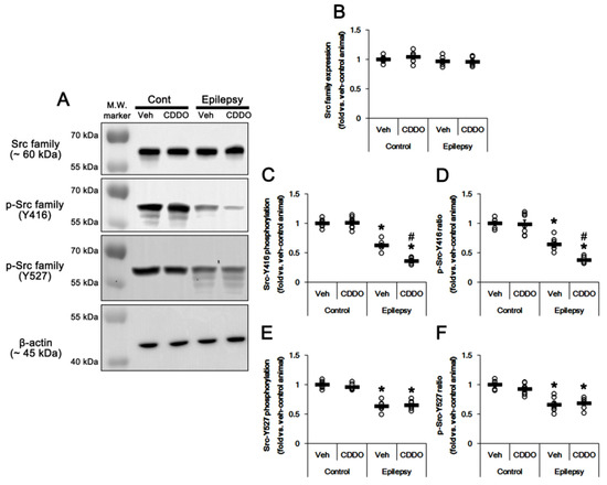 As aforementioned, CK2 increased its catalytic activity by Src family protein tyrosine kinases-mediated phosphorylation at the Y255 residue [37,46]. The Src family of protein tyrosine kinase activities are regulated by tyrosine phosphorylation at two sites, but with opposing effects. Autophosphorylation of tyrosine (Y) 396 (equivalent to Y416 of Src), located in the catalytic domain, upregulates Src kinase activity. Y507 phosphorylation (equivalent to Y527 of Src) inactivates the kinase activity, while dephosphorylation of this site is not sufficient for full kinase activation [49,50]. Interestingly, CDDO-Me affects Src and AKT activation [51,52]. Thus, we evaluated the effect of CDDO-Me on Src family activities. As compared to the control hippocampus, Src family-Y416 phosphorylation was reduced in the epileptic hippocampus without changing Src family expression (t(12) = 19.4, p < 0.00001 vs. control animals, Student t-test, n = 7, respectively; Figure 6A–C, Figure S5). p-Src-Y416 family ratio was also decreased in the epileptic hippocampus (t(12) = 6.7, p = 0.00002 vs. control animals, Student t-test, n = 7, respectively; Figure 6A,D, Figure S5). CDDO-Me reduced the p-Src-Y416 level (F(3,24) = 108.3, p < 0.00001 vs. vehicle, one-way ANOVA, n = 7, respectively; Figure 6A,C, Figure S5) and its ratio (F(3,24) = 46.7, p < 0.00001 vs. vehicle, one-way ANOVA, n = 7, respectively; Figure 6A,D, Figure S5) in the epileptic hippocampus, but not the normal hippocampus. In addition, Src family-Y527 phosphorylation was decreased in the epileptic hippocampus (t(12) = 9.1, p < 0.00001 vs. control animals, Student t-test, n = 7, respectively; Figure 6A,E) and p-Src-Y527 ratio (t(12) = 6.5, p = 0.00003 vs. control animals, Student t-test, n = 7, respectively; Figure 6A,F). However, CDDO-Me did not affect p-Src-Y527 level (t(12) = 0.5, p = 0.65 vs. vehicle, Student t-test, n = 7, respectively; Figure 6A,E, Figure S5) and its ratio (t(12) = 0.4, p = 0.68 vs. vehicle, Student t-test, n = 7, respectively; Figure 6A,F) in the epileptic hippocampus. These findings indicate that CDDO-Me may activate PTEN by inhibiting the Src family-CK2 signaling pathway.