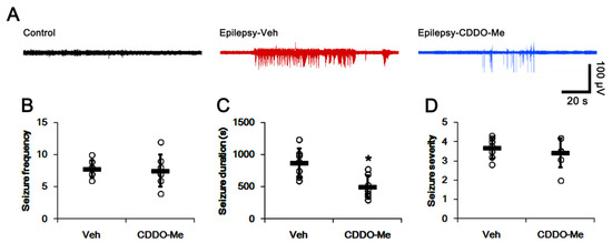 Effects of CDDO-Me on spontaneous seizure activity in epileptic rats. CDDO-Me treatment reduces seizure duration, but not seizure frequency and its severity in epileptic rats. (A) Representative EEG traces obtained from control and epileptic rats. (B–D) Quantitative values of total seizure frequency (B), total seizure duration (C) and seizure severity (D) over a 4-day period. Open circles indicate each individual value. Horizontal bars indicate mean value. Error bars indicate SD (* p < 0.05 vs. vehicle (Veh)-treated animals; Mann–Whitney U-test for seizure frequency and seizure severity; Student t-test for seizure duration; n = 7).