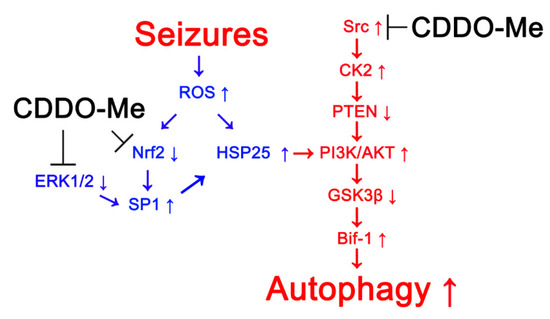 Schematic depiction representing the effects of CDDO-Me on astroglial autophagy (clasmatodendrosis). CDDO-Me activates Nrf2-mediated antioxidant defense mechanisms and SP1 suppression, which inhibit further ROS synthesis and HSP25 induction, respectively. In addition, CDDO-Me facilitates ERK1/2-SP1-mediated HSP25 suppression that abrogates PI3K/AKT activation. CDDO-Me also abolishes the PI3K-AKT-Bif-1 signaling pathway by repressing Src-CK2-mediated PTEN inhibition.