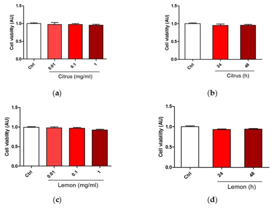 Dose and time dependent effects of commercial (citrus) and lemon IntegroPectin (lemon) pectins on neuronal cell viability: (a) Cell viability of citrus in dose dependent experiment; (b) Cell viability of citrus in time dependent experiment; (c) Cell viability of Lemon IntegroPectin in dose dependent experiment; (d) Cell viability of Lemon IntegroPectin in time dependent experiment.
