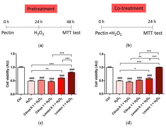 Oxidative insult during pretreatment and co-treatment with commercial (citrus) and lemon IntegroPectin (lemon) pectins: (a) Scheme of cell pretreatment with pectins; (b) Scheme of cell co-treatment with pectins; (c) Cell viability of pretreatment in dose dependent experiment; (d) Cell viability of co-treatment in dose dependent experiment. Tukey test: ### p < 0.001 as compared to control (Ctrl) group; * p < 0.05, ** p < 0.01, *** p < 0.001.