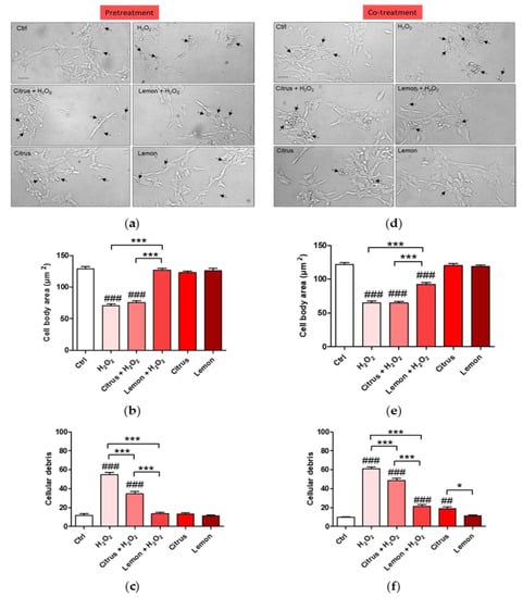 Effects of commercial (citrus) and lemon IntegroPectin (lemon) pectins on neuronal cell morphology in pretreatment and co-treatment: (a) Representative morphological images of the pretreatment of untreated cells (Ctrl) or treated with pectins or with H2O2 alone or in combination with pectins; examples of cell debris are indicated by arrows; (b) Histogram of the pretreatment of untreated cells (Ctrl) or treated or with H2O2 alone or in combination with pectins, cell body area; (c) Histogram of the pretreatment of untreated cells (Ctrl) or treated or with H2O2 alone or in combination with pectins, number of cells debris; (d) Representative morphological images of co-treatment of untreated cells (Ctrl) or treated with pectins or with H2O2 alone or in combination with pectins; examples of cell debris are indicated by arrows; (e) Histogram of the co-treatment of untreated cells (Ctrl) or treated or with H2O2 alone or in combination with pectins, cell body area; (f) Histogram of the co-treatment of untreated cells (Ctrl) or treated or with H2O2 alone or in combination with pectins, number of cells debris. Bar: 50 μm. Tukey test: ## p < 0.01, ### p < 0.001 as compared to control (Ctrl) group; * p < 0.05, *** p < 0.001.