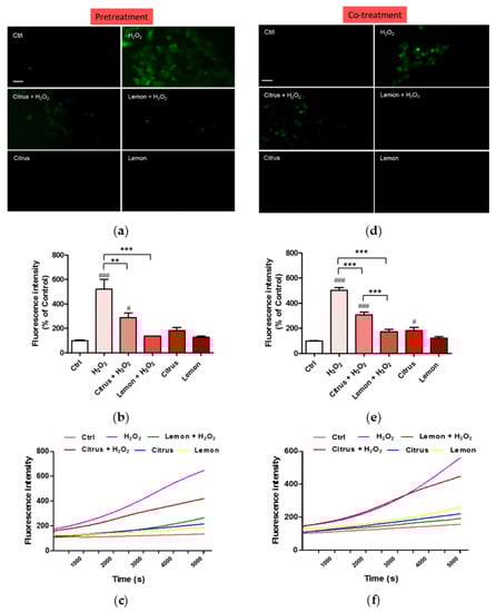 Effects of commercial (citrus) and lemon IntegroPectin (lemon) pectins on ROS production driven by exposure to aqueous H2O2: (a) fluorescence microscopy images of the pretreatment of untreated cells (Ctrl) or treated with pectins or with H2O2 alone or in combination with pectins; (b) fluorescence intensity of the pretreatment of untreated cells (Ctrl) or treated with pectins or with H2O2 alone or in combination with pectins measured by the DCFH-DA fluorescence assay; (c) oxidation kinetics of the pretreatment of untreated cells (Ctrl) or treated with pectins or with H2O2 alone or in combination with pectins; (d) fluorescence microscopy images of the co-treatment of untreated cells (Ctrl) or treated with pectins or with H2O2 alone or in combination with pectins; (e) fluorescence intensity of the co-treatment of untreated cells (Ctrl) or treated with pectins or with H2O2 alone or in combination with pectins measured by the DCFH-DA fluorescence assay; (f) oxidation kinetics of the co-treatment of untreated cells (Ctrl) or treated with pectins or with H2O2 alone or in combination with pectins. Bar: 50 μm. Tukey test: # p < 0.05, ### p < 0.001 as compared to control (Ctrl) group; ** p < 0.01, *** p < 0.001.
