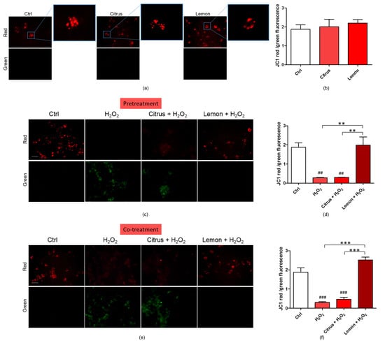 Effects of commercial (citrus) and lemon IntegroPectin (lemon) pectins on JC-1 red and green fluorescence affected by exposure to aqueous H2O2: (a) Fluorescence microscope inspection of cells treated with pectins alone submitted to JC-1 assay, the magnifications highlight the shape of the mitochondria, (b) histogram representing the ratio between red and green fluorescence intensity; (c) Fluorescence microscope inspection of cells untreated (Ctrl), treated with H2O2 alone, or pretreated with pectins and then with H2O2 submitted to JC-1 assay; (d) histogram representing the ratio between red and green fluorescence intensity in pretreatment experiment; (e) fluorescence microscope examination of cells untreated (Ctrl), treated with H2O2 alone or co-treated with pectins and H2O2 submitted to JC-1 assay; (f) histogram representing the ratio between red and green fluorescence intensity in cotreatment experiment. Bar: 100 μm. Tukey test: ## p < 0.01, ### p < 0.001 as compared to control (Ctrl) group; ** p < 0.01, *** p < 0.001.