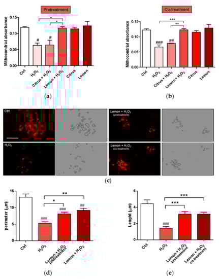 Effects of commercial (citrus) and lemon IntegroPectin (lemon) pectins on mitochondrial morphology and remodeling affected by exposure to aqueous H2O2: (a) Mitochondria remodeling of the pretreatment of untreated cells (Ctrl) or treated with pectins or with H2O2 alone or in combination with pectins; (b) Mitochondria remodeling of the co-treatment of untreated cells (Ctrl) or treated with pectins or with H2O2 alone or in combination with pectins; (c) Representative fluorescence microscopy images of mitochondria stained with the MitoTracker Deep Red in untreated cells (Ctrl) or treated with H2O2 alone or in combination with lemon IntegroPectin (pretreatment and co-treatment); (d,e) Histograms representing quantification of mitochondria perimeter and length, respectively, in untreated cells (Ctrl) or treated with H2O2 alone or in combination with lemon IntegroPectin (pretreatment and co-treatment). Bar: 50μm. Tukey test: # p < 0.05, ## p < 0.01, ### p < 0.001 as compared to control (Ctrl) group; * p < 0.5, ** p < 0.01, *** p < 0.001.
