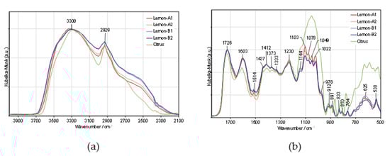 Comparison of the DRIFT spectra of lemon IntegroPectin (Lemon-A and Lemon-B) and commercial (Citrus) pectin: (a) 4000–2100 cm−1 and (b) 200–950 cm−1 spectral regions.