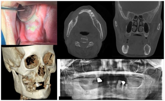 - Lesclous, P.; Grabar, S.; Abi Najm, S.; Carrel, J.P.; Lombardi, T.; Saffar, J.L.; Samson, J. Relevance of surgical management of patients affected by bisphosphonate-associated osteonecrosis of the jaws. A prospective clinical and radiological study. Clin. Oral Investig. 2014, 18, 391–399. [Google Scholar] [CrossRef]