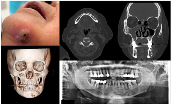 Case 4 with MRONJ Stage 3: Clinical photo, panoramic view, and computed tomography imaging including three-dimensional reconstruction showing extraoral fistula and necrotic bone on the mandibular left anteroposterior area. An 80-year-old female patient with a history of intravenous administration of ibandronate and denosumab for one year was presented with inflammation and skin fistula on the chin area. She had undergone periodontal treatment on the left lower posterior teeth three months ago due to a periodontal abscess, but she was referred for recurrence with facial swelling from a private dental clinic. Bony lesions involving the inferior border of the mandible and the presence of extraoral fistula were observed.