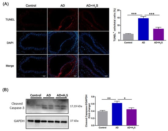 TUNEL staining was performed to detect apoptosis in aortic samples from mice. The results demonstrated that the AD group exhibited significantly increased cell apoptosis; however, H2S treatment attenuated the apoptotic cells (Figure 2A). Western blotting indicated that the AD group exhibited significantly higher cleaved caspase-3 levels than the control group. Notably, H2S administration reduced the expressions of cleaved caspase-3 (Figure 2B). The data indicated that H2S declined cell death in AD.