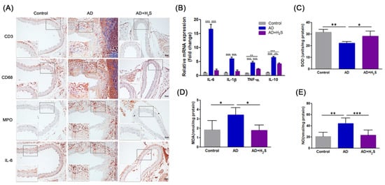 Immunohistochemical analysis was performed on the aorta of mice to evaluate the extent of inflammatory cell infiltration. As illustrated in Figure 3A, aortas from the AD group contained abundant CD3, CD68, and MPO positive cells and IL-6 expression. These were located primarily in the tunica adventitia, with fewer inflammatory cells scattered throughout the aortic tissues of H2S-administered mice. We also examined the effects of H2S treatment on the expression of proinflammatory cytokines in the aorta; these cytokines are known to be involved in AD development. The analysis of aortic specimens revealed that mRNA expression levels of IL-6, IL-1β, TNF-α, and IL-10 were markedly higher in the AD group. By contrast, the upregulation of these factors was significantly suppressed in the H2S group (Figure 3B).