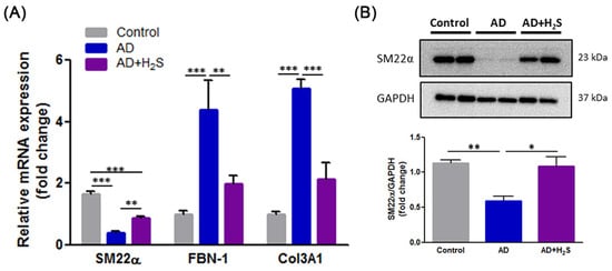 VSMCs switch from a contractile to a synthetic phenotype that has been attributed to vascular malfunction under pathological conditions [8]. mRNA sequencing was thus performed to discern differential gene expressions in aortic tissues from experimental mice. The results revealed that the SM22α gene was downregulated whereas the FBN-1 and Col3A1 genes were upregulated. However, H2S treatment reversed these alternate gene expressions (Figure 4A). Western blotting further revealed that H2S administration countered the undesirable changes in SM22α (Figure 4B). These results demonstrated that H2S has the ability to maintain the VSMC contractile phenotype. Our data thus suggested that H2S treatment prevents the VSMC phenotypic switch in AD.